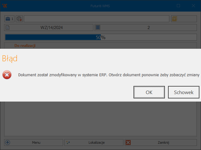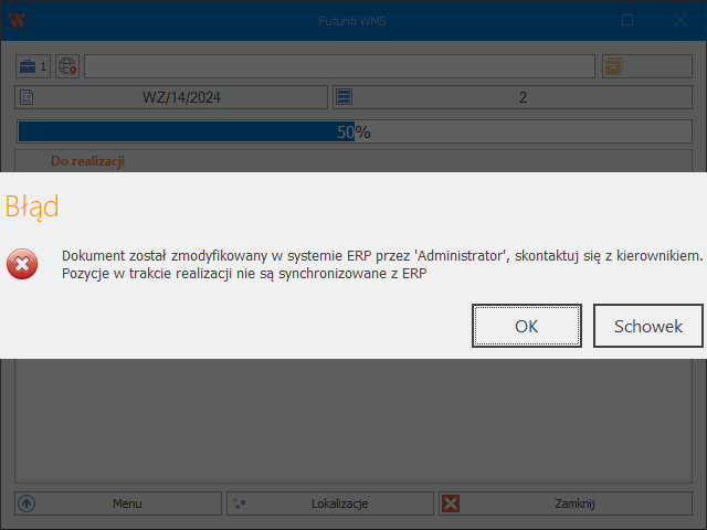 Jeśli zmodyfikowany dokument został już podjęty przez pracownika magazynu. Na dokument zostanie naniesiony atrybut „BŁĄD SYNCHRONIZACJI”, a osoba realizująca dokument przy próbie skanowania otrzyma informację o potrzebie ponownego otwarcia dokumentu