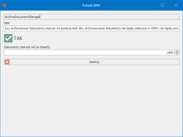 Aby włączyć archiwizację zaznacz checkbox TAK i wybierz ilość dni przez ile dokumenty mają być przetrzymywane w WMS po ich realizacji.