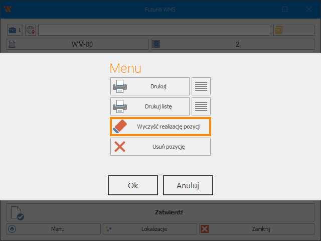 W przypadku pomyłki istnieje możliwość wyczyszczenia realizacji pojedynczej pozycji, jeśli nie jest wymagane wyczyszczenie całego dokumentu.
