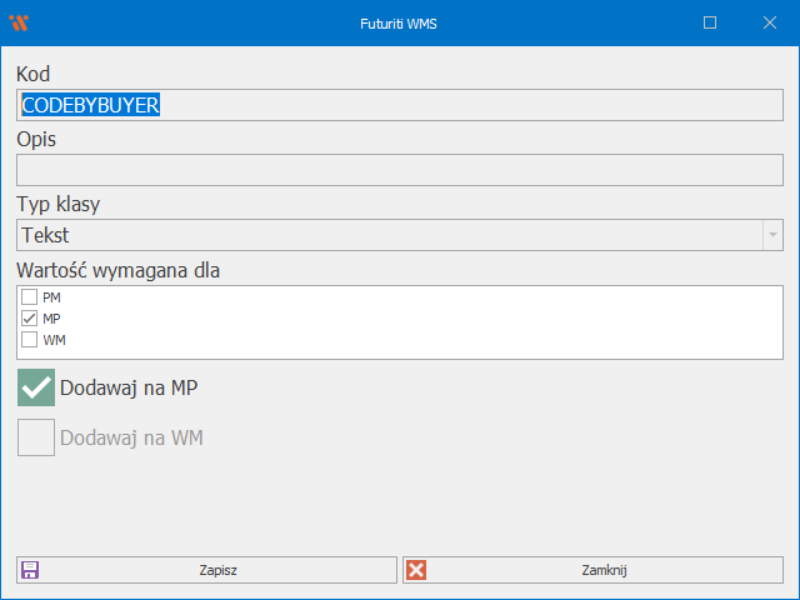 Futuriti WMS pozwala na dodanie klasy atrybutu z poziomu UI