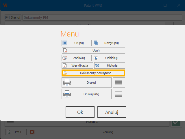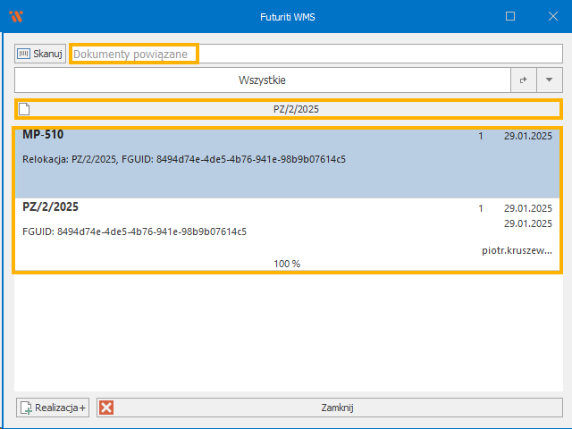 W niektórych przypadkach WMS generuje serię dokumentów (np. proces dwuetapowy). Aby usprawnić proces wyszukiwania dokumentów utworzonych w zakresie jednego procesu lub realizacji od wersji 1.856 możliwe jest wyszukanie dokumentów powiązanych z poziomu listy dokumentów.