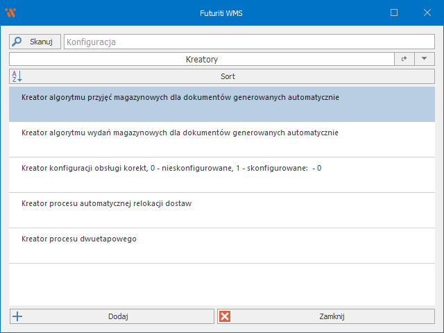 Aby edytować algorytm wydań, należy przejść do: Menu główneOpcjeKonfiguracjaKreatory.