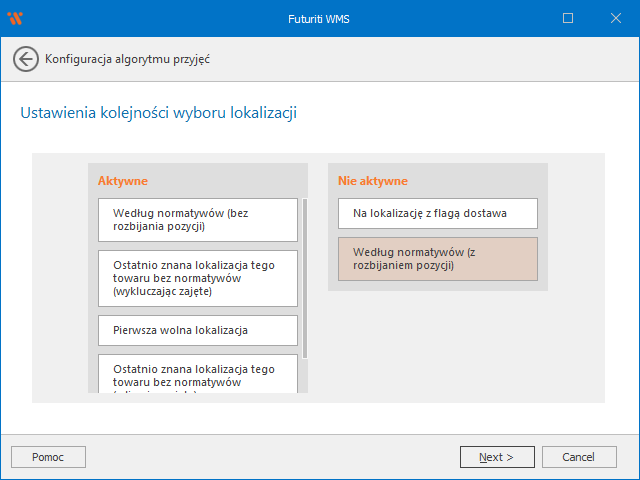 W przypadku algorytmu przyjęć magazynowych, system przetwarza kroki kolejno, aż któryś z nich spełni warunki. Jeżeli pierwszy krok spełnia kryteria, algorytm natychmiast kończy pracę, a dalsze kroki nie są analizowane. Gdy kilka lokalizacji spełnia warunek, wybrana zostanie pierwsza z nich. Wyjątkiem jest krok „Według normatywów (z rozbijaniem pozycji)”, który zrestartuje algorytm dla nowo utworzonej pozycji.
