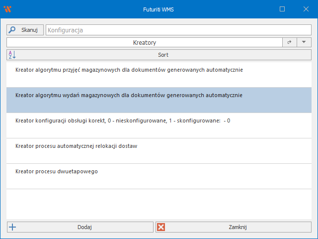 Aby edytować algorytm wydań, należy przejść do: Menu główne → Opcje → Konfiguracja → Kreatory.