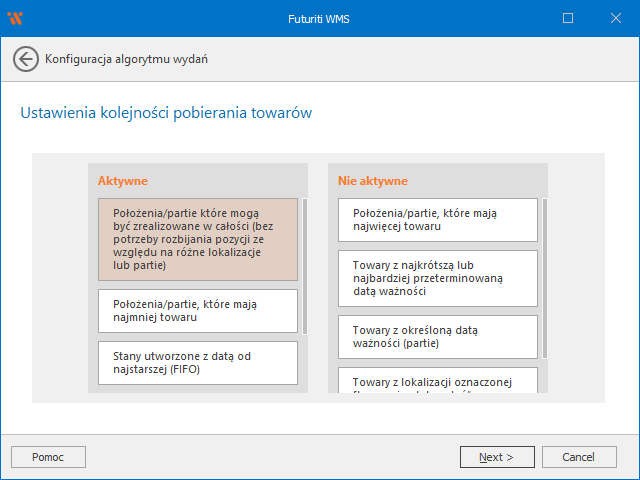 Na podstawie przedstawionej konfiguracji, algorytm najpierw wybierze stany magazynowe, które mogą w pełni zrealizować zamówienie bez konieczności jego rozbijania. Jeśli spełnia to kilka położeń, zostaną one posortowane według najmniejszej ilości towaru. Jeśli to nie wystarczy, wybór padnie na położenie z najstarszą datą utworzenia.