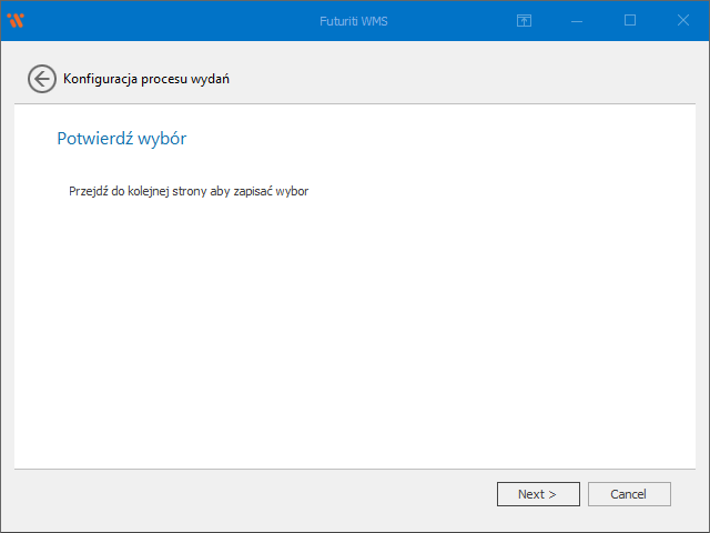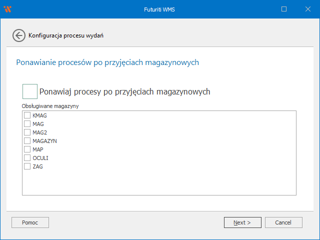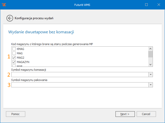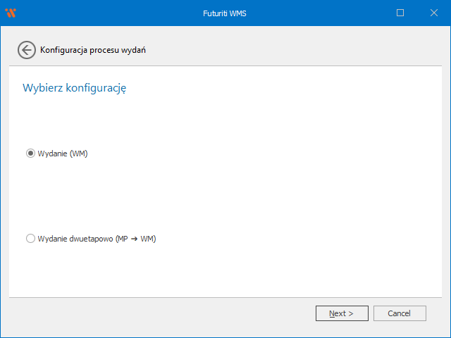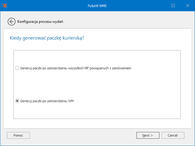 Konfiguracja procesu wydań w integracji z Futuriti WMS odbywa się poprzez kreator w WMS. Dla poprawnego działania procesu należy skonfigurować przynajmniej jedną lokalizację pakowania na magazynie