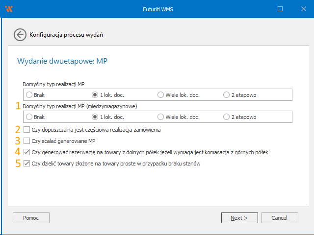 • Wydanie dwuetapowo (MP → WM) – proces dwuetapowy, w którym po zsynchronizowaniu zamówienia, WMS wygeneruje dokumenty MP z lokalizacji na pakowanie, po realizacji tych dokumentów, odblokowany zostanie dokument WM. Proces ten nie wymaga akcji w ERP