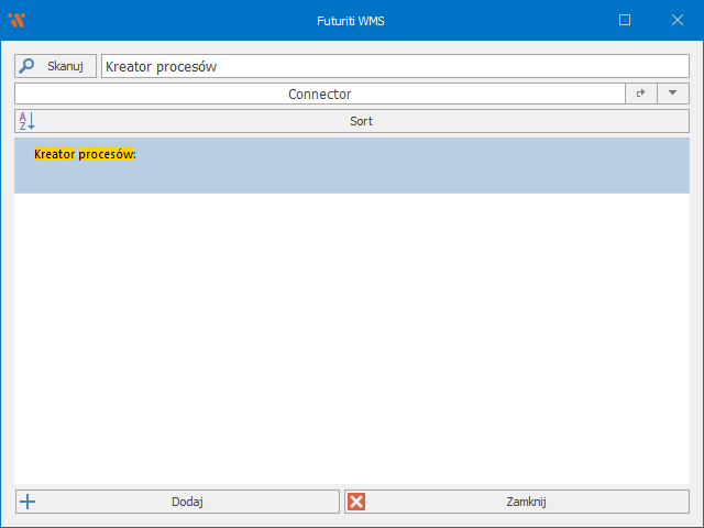 W menu głównym nawiguj do konfiguracji: zakładka Opcje → Konfiguracja, następnie przejdź do filtra Connector i wyszukaj wpis Kreator procesów