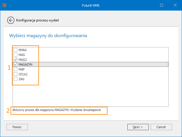 Z listy magazynów (1) wybierz magazyny, które mają współdzielić konfigurację. Aktualna konfiguracja magazynu widoczna jest pod listą (2) w momencie wybrania magazynu na liście.