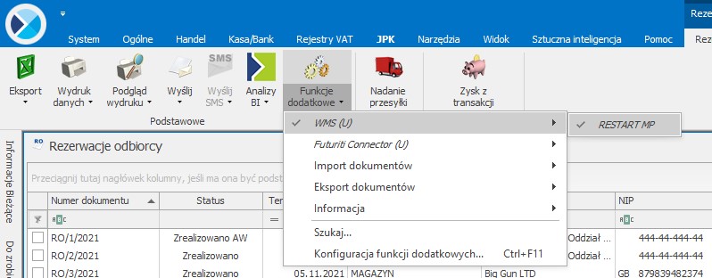 Jeżeli pojawi nam się zamówienie RO, do którego nie zostało wygenerowane MP z powodu braku stanów na produkt, należy skorzystać z przygotowanego przy wdrożeniu skryptu restartu zapytania generującego dokument MP (aby zadziałało poprawnie należy uzupełnić stany towarowe):