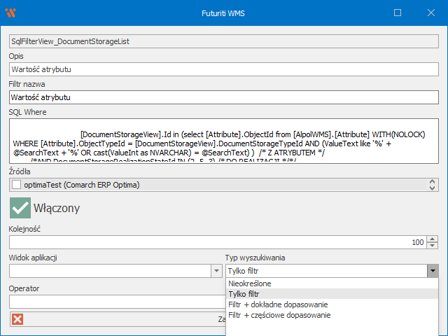 - Źródła – dla jakich źródeł (WMS 3PL) ma być dostępny filtr, jeśli nie wybrano żadnego, będzie widoczny na wszystkich źródłach