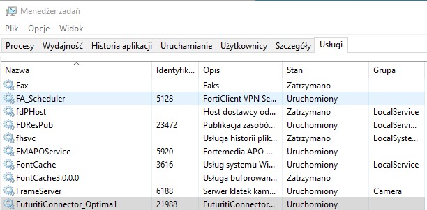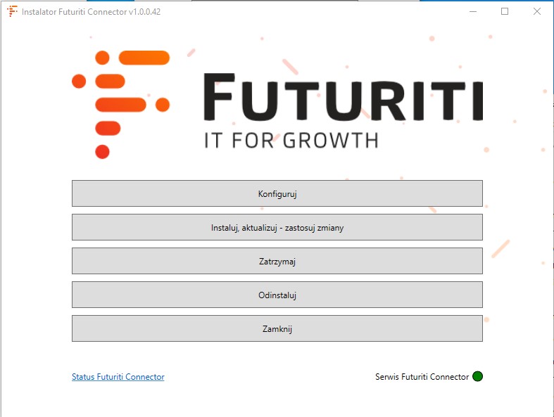 - Klawisz Zatrzymaj wstrzymuje działanie usługi Futuriti Connector: