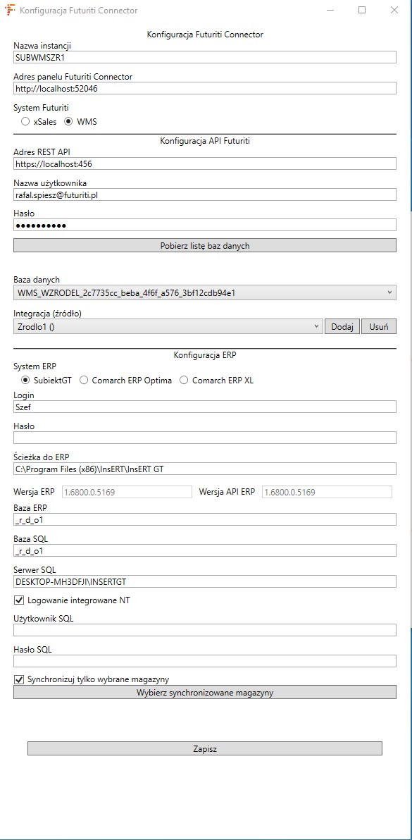 - Klawisz KONFIGURUJ służy do ustawienia połączenia z API WMS oraz ERPem.