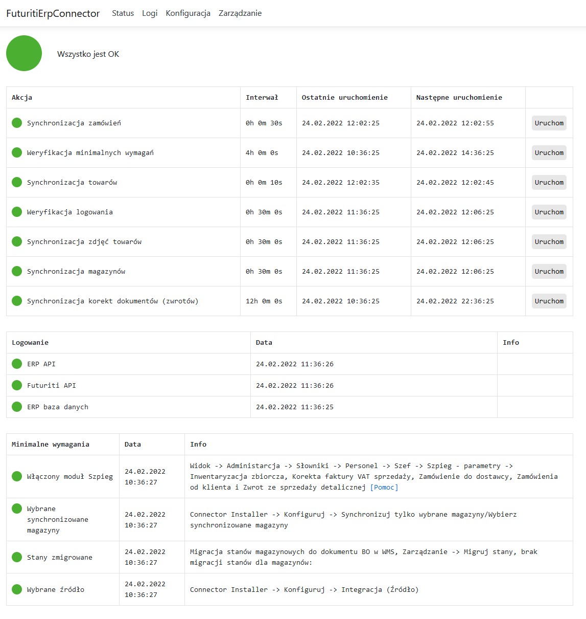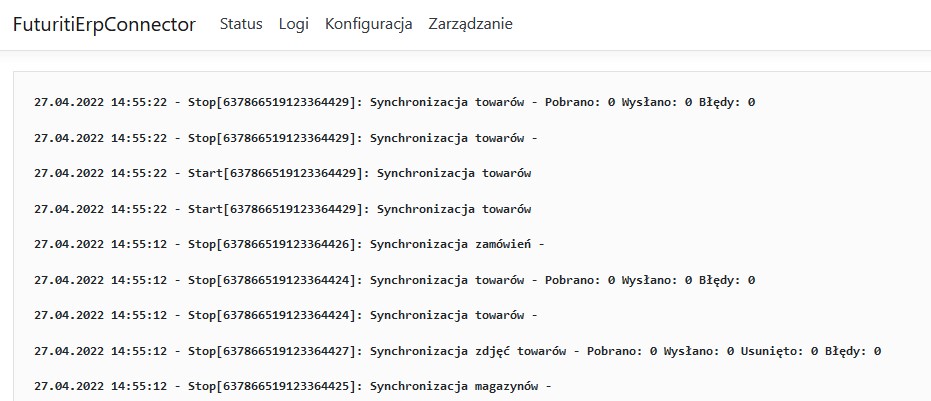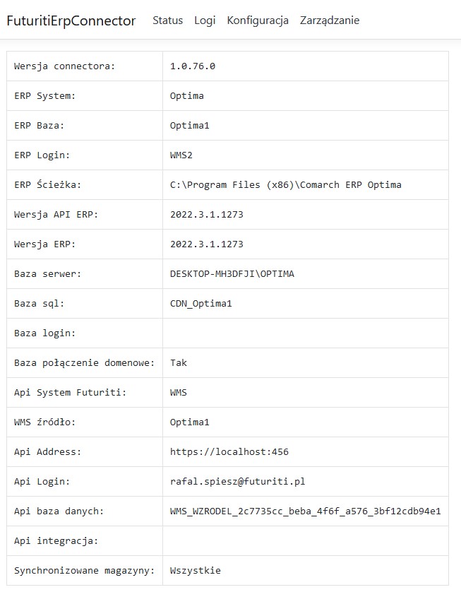 - Klawisz Status Futuriti Connector uruchamia panel administracyjny, który pokazuje nam: