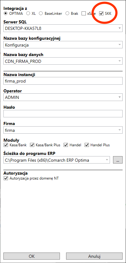 w oknie konfiguracji wybierz opcję integracji z SKK jak pokazano na zrzucie