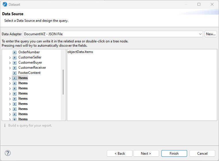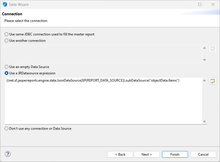 W tym samym oknie należy skonfigorwać źródło danych dla subreportu. Aby wybrać zbiór danych, należy w Data Source Expression podać ścieżkę do zbioru danych, w naszym przypadku zbiór Items – jako zbiór danych ustawiamy objectData.Items