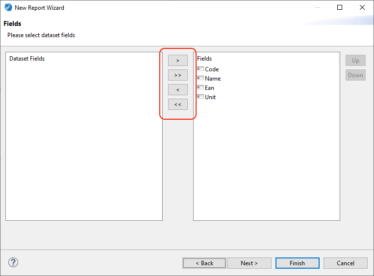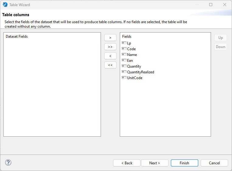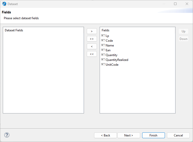 Przenieś wymagane pola z kolumny Dataset Fields do Fields za pomocą oznaczonych przycisków, w następnym kroku możliwe jest wybranie pól do grupowania, jednak nie jest to wymagane, zatwierdź nowy raport za pomocą przycisku Finish