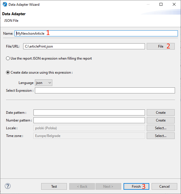 Uzupełnij nadaj dowolną nazwę dla nowego adaptera (1) oraz wskaż ścieżkę do pliku JSON klikając przycisk File (2) upewnij się, że opcja Create data source using this expression jest zaznaczona, i zatwierdź przyciskiem Finish (3)