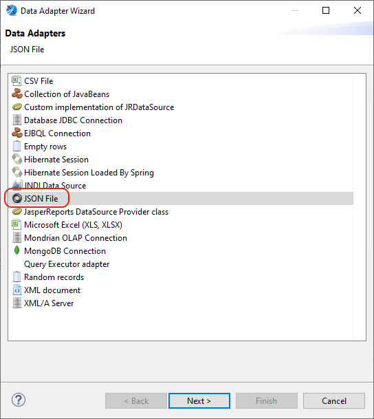 Wybierz typ JSON File i zatwierdź przyciskiem Next
