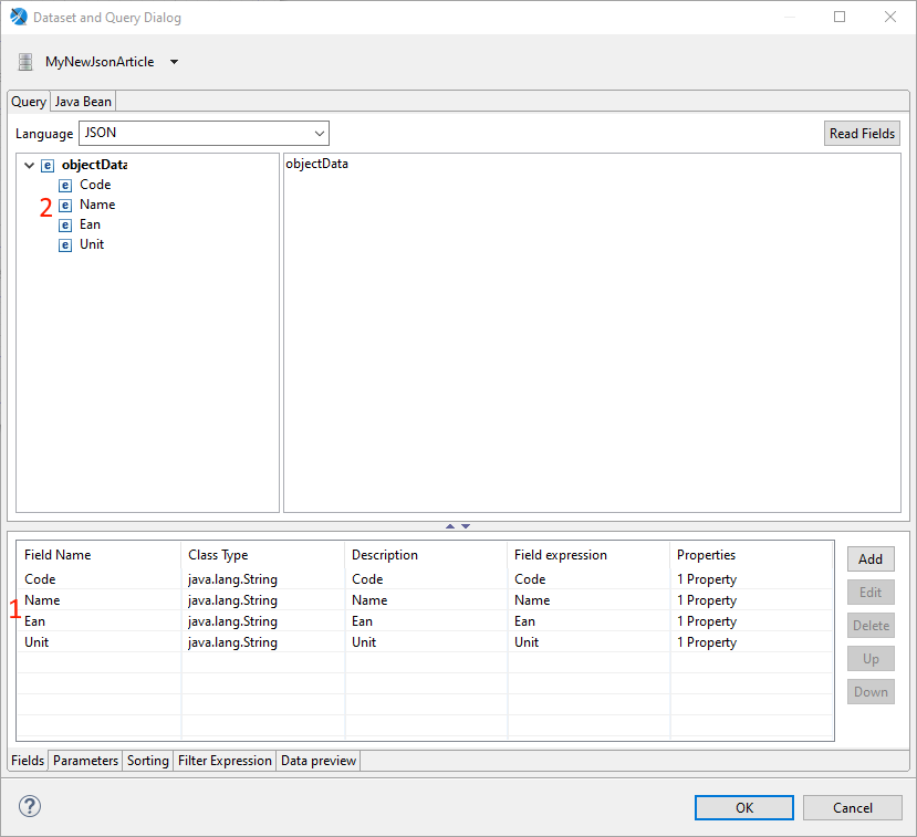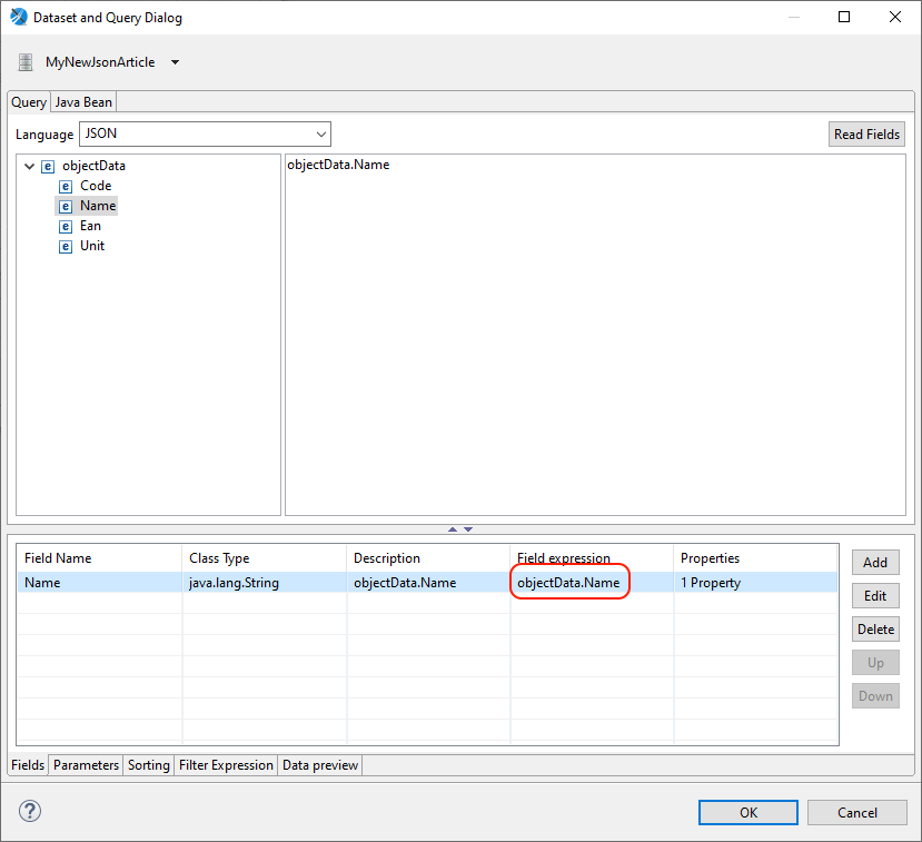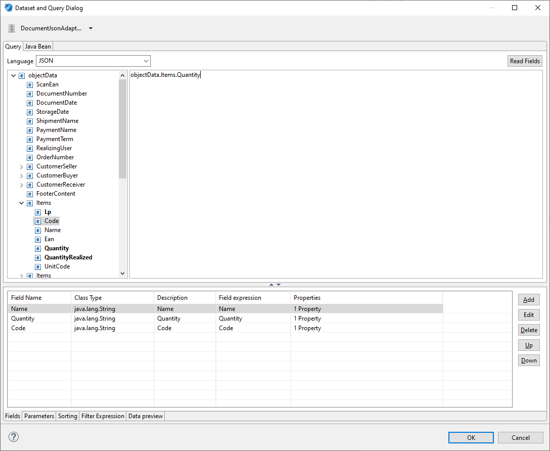 - Field Expression – dokładna ścieżka do której dane pole (z poziomu Jaspersoft Studio) odwołuje się do pola w json