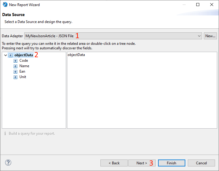 Wybierz z listy Data Adapter uprzednio utworzony adapter dla pliku JSON (1), po wybraniu źródła zostaną wyświetlone dostępne pola, wybierz klikając dwukrotnie pozycję objectData (2) i przejdź do następnego kroku (3)