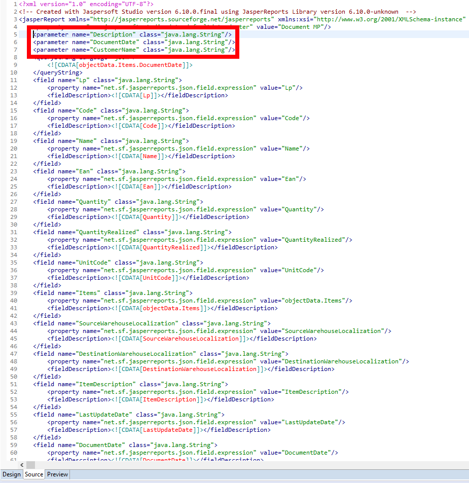 Jeśli subreport wymaga podania pól, które nie są zawarte w zbiorze danych (w przykładzie powyżej, w zbiorze Items) należy przejść do zakładki Source i na górze kodu nazwać wymagane parametry