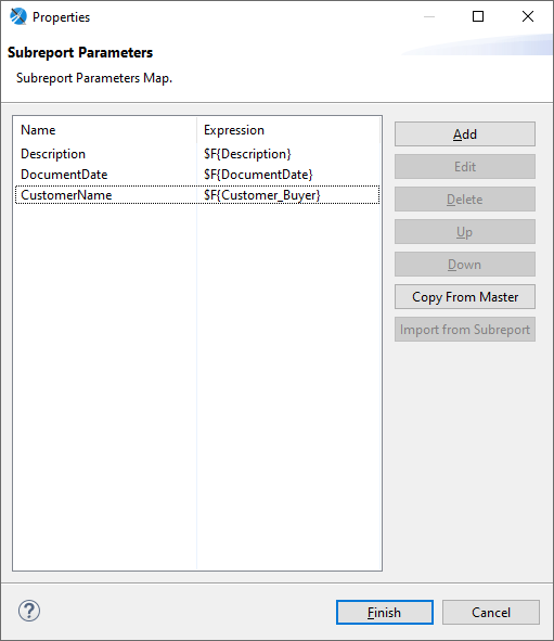 - Expression – odpowiada wartości jaką chcemy wysłać do subreportu