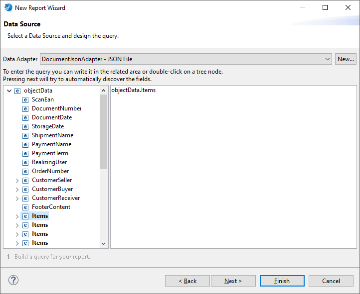 Wybrane pola można przeciągać na raport, co automatycznie utworzy powiązanie z odpowiednim polem w pliku JSON