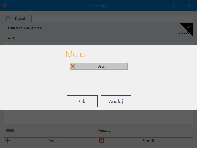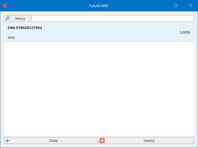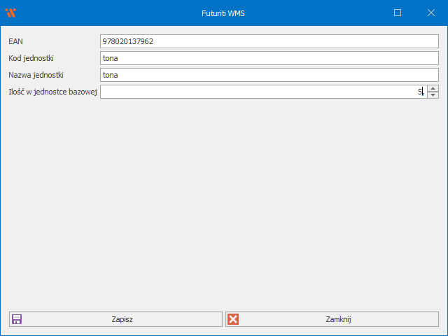 FuturitiWMS pozwala na przypisanie różnych kodów EAN towaru do różnych jednostek, dla przykładu jednostka „tona” może odnosić się do 5 sztuk towaru