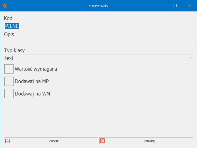 Lista klas atrybutów znajduje się w menu głównym Futuriti WMS w zakładce Słowniki