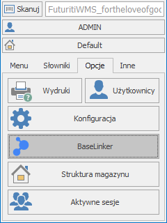 W celu zmiany konfiguracji ustawionej podczas procesu instalacji należy uruchomić WMS i przejść zakładki Opcje → BaseLinker (filtr zostanie ustawiony automatycznie) lub alternatywnie Opcje → Konfiguracja