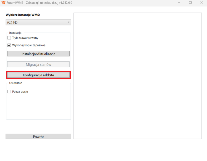 Konfiguracja integracji z xSale jest dostępna z poziomu instalatora FutritiWMS pod nazwą „Konfiguracja Rabbita„.