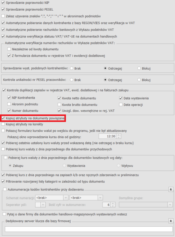 Przenoszenie atrybutów na dokumenty korygujące jest uzależnione od ustawienia parametru w Konfiguracji firmy/ Ogólne/