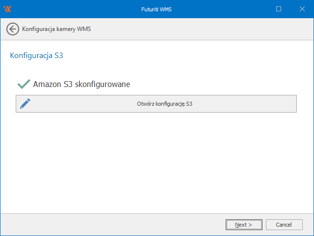 Jeśli konfiguracja nie została jeszcze przeprowadzona, można otworzyć konfigurator przyciskiem Otwórz konfigurację S3, otwarty zostanie konfigurator, opis konfiguracji można znaleźć tutaj. Po ukończeniu konfiguracji status zostanie zaktualizowany.