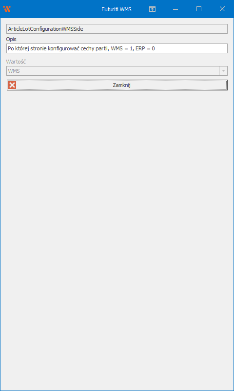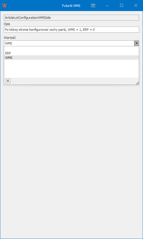 Domyślnie WMS przechowuje konfigurację cech partii po stronie ERP, oznacza to, że zmiana konfiguracji cechy partii w ERP synchronizowana jest z WMS i wszystkie zmiany wprowadzone po stronie WMS zostaną nadpisane przy edycji towaru w ERP. W rezultacie pola dostępne w WMS odwołujące się do partii zostaną oznaczone jako pola tylko do odczytu by zapobiec utracie edycji.