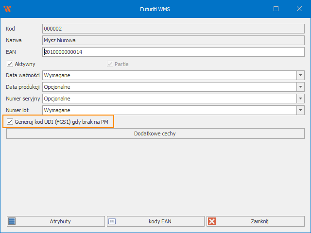 Futuriti WMS pozwala na włączenie/wyłączenie obsługi wybranych kodów UDI