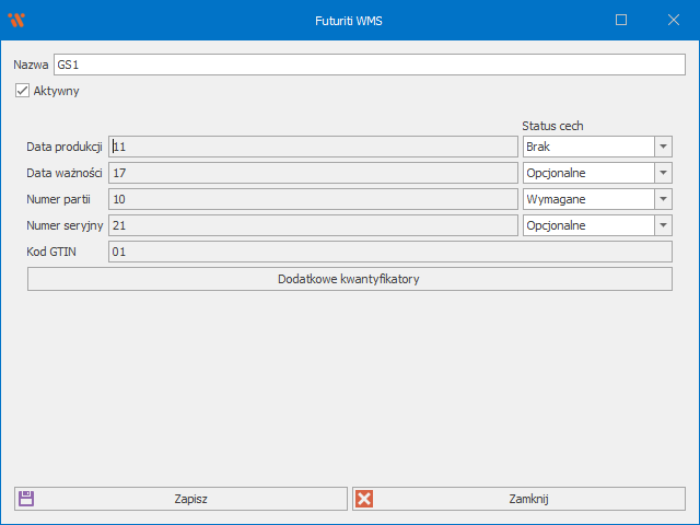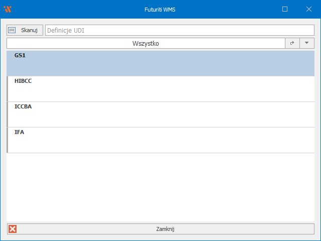 Może przydarzyć się, że towar mimo obsługi UDI nie posiada kodu UDI lub jest nieprawidłowo skonfigurowany. W takim przypadku WMS dodaje obsługę FGS1, który jest standardem kodowania cech przyjętym w FuturitiWMS, specyfikacja kodu znajduje się tutaj.