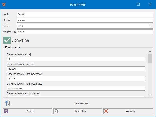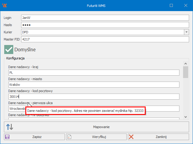 Poprawność skonfigurowanego loginu i hasła można zweryfikować przyciskiem Weryfikuj