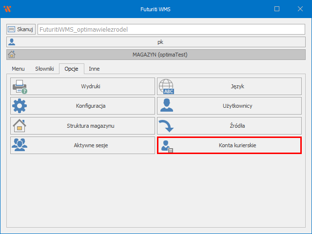 W menu głównym WMS przejdź do zakładki Opcje następnie kliknij przycisk Konta kurierskie