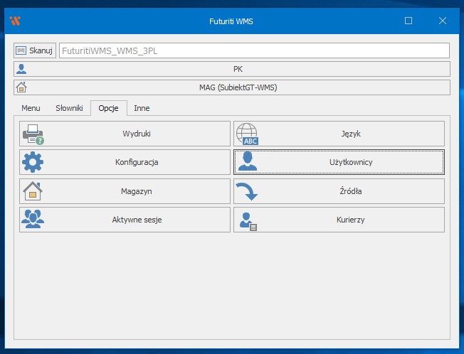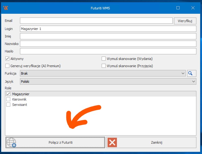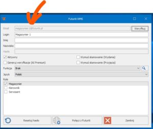 Podłączenie futuriti do aktywnego użytkownika WMS może zrealizować użytkownik w roli „Kierownik” lub „Serwisant” z aktywnym kontem Futuriti: