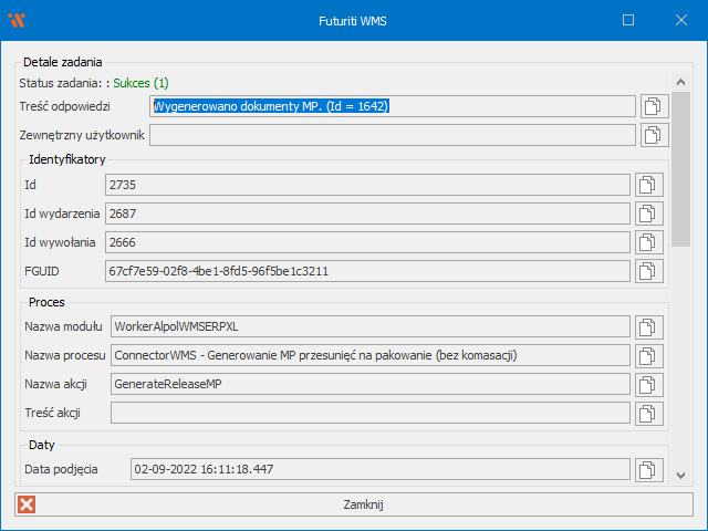 Po wejściu w zadanie (dwuklik na liście zadań) wyświetlona zostanie formatka zawierająca szczegółowe informację na temat zadania