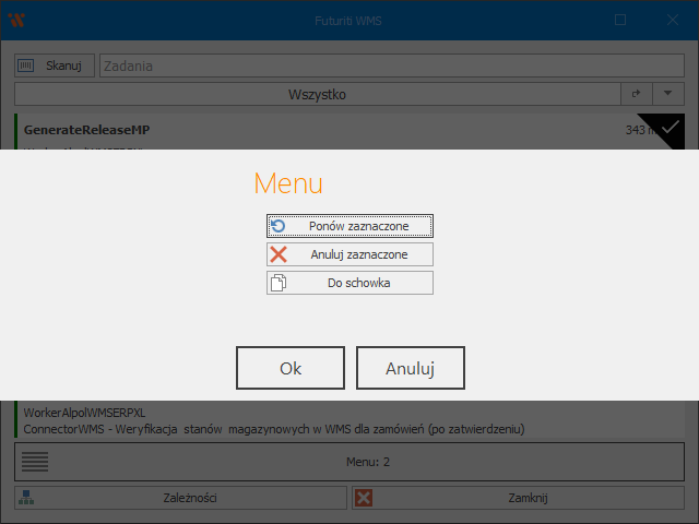 Zaznacz prawym klawiszem myszy zadania, dla których należy wykonań operację, wybierz przycisk Menu, zostaną wyświetlone opcje