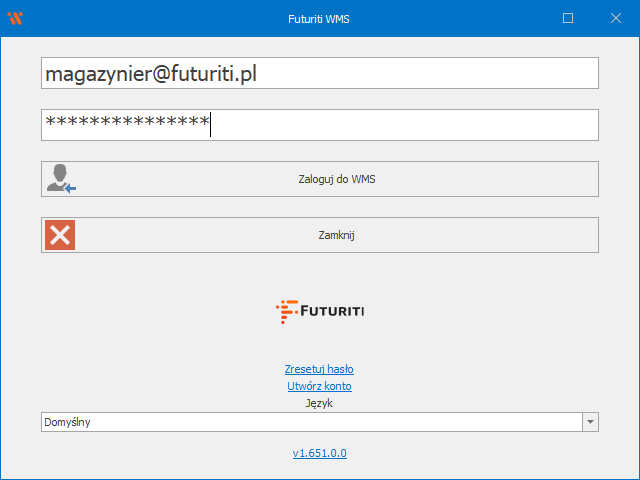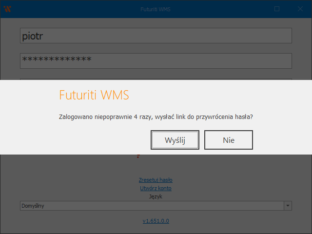 Jeśli użytkownik nie logował się do WMS przez okres 14 dni lub po upływie 30 dni, konto wymagać będzie ponownego uwierzytelnienia za pomocą hasła do konta Futuriti