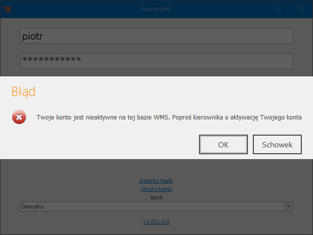 W przypadku, gdy konto użytkownika powiązane jest z kontem Futuriti oraz użytkownik nie posiada dostępu do instancji WMS lub konto jest nieaktywne zostanie wyświetlony stosowny komunikat.