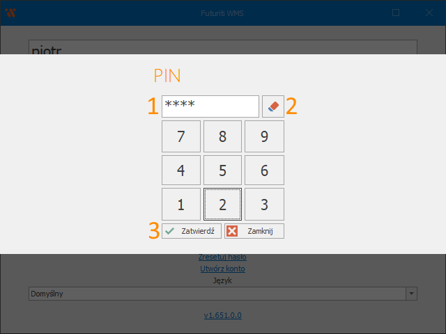 Kod PIN należy wprowadzić w pole tekstowe (1) z klawiatury lub za pomocą panelu numerycznego na ekranie. W przypadku pomyłki możliwe jest wyczyszczenie wprowadzonego PIN’u przyciskiem gumki (2).