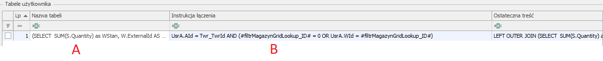 W „Tabele użytkownika” w kolumnie „Nazwa tabeli” [A] wpisujemy podzapytanie: