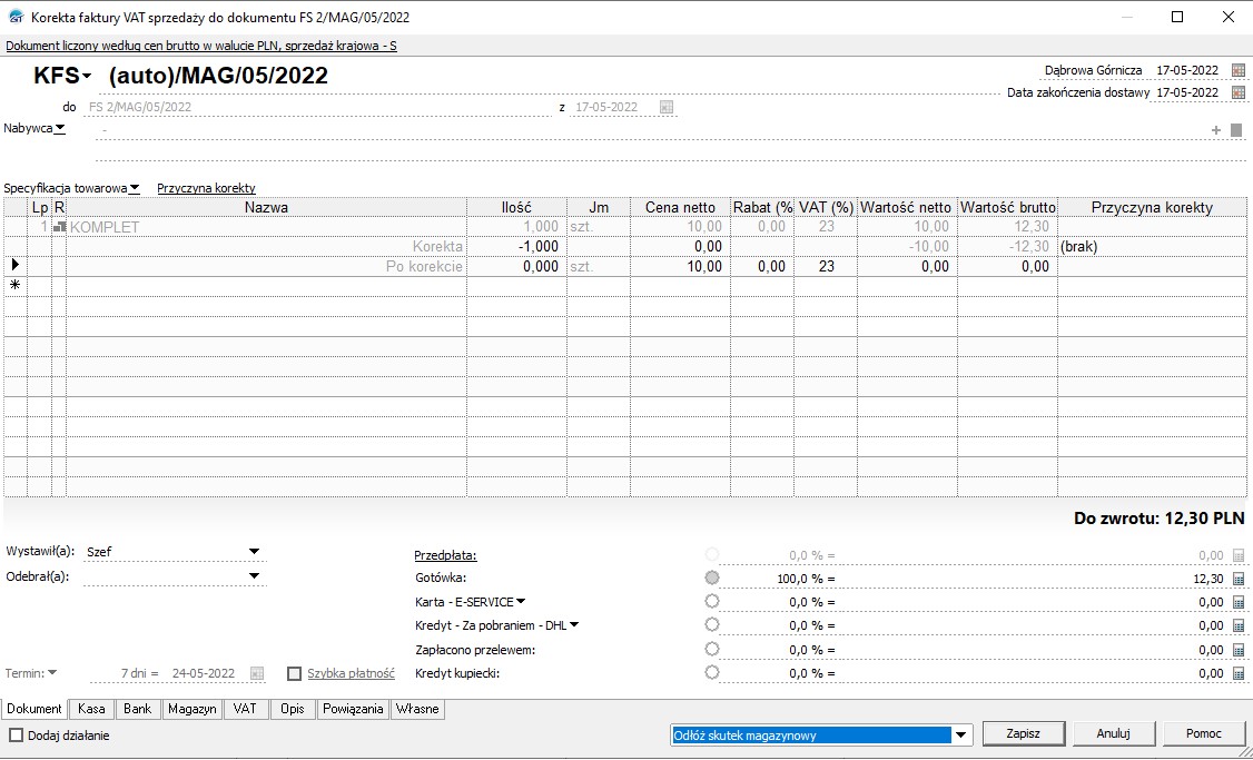- Tworzymy dokument korekty faktury sprzedaży lub zakupu w statusie „Odłóż skutek magazynowy”.