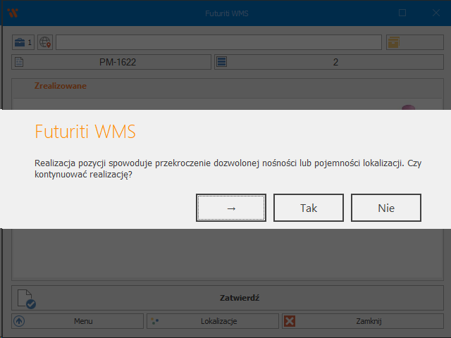 Jeśli zatwierdzi go, system doda towar do lokalizacji mimo przekroczenia jej parametrów.