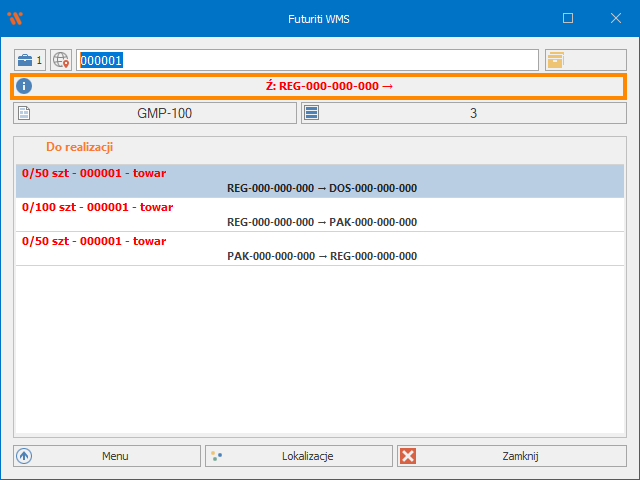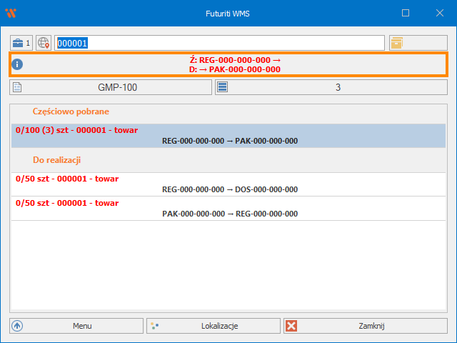 Każdy następny skan towaru 000001 będzie realizował konkretną pozycję. Zapamiętana lokalizacja docelowa zostanie wyczyszczona w momencie pełnego zrealizowania pozycji lub poprzez kliknięcie w oznaczoną belkę