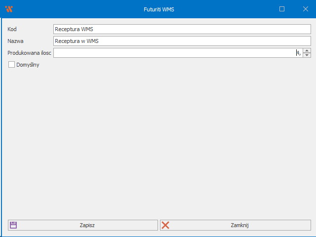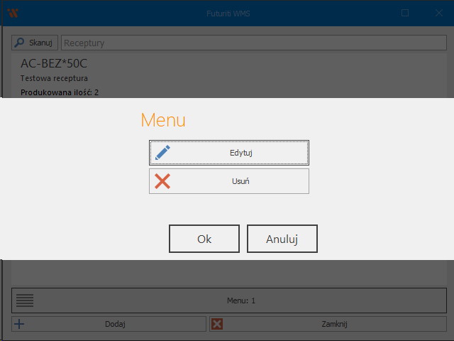 Tylko receptury utworzone w WMS mogą być edytowane lub usuwane. Zmiany w recepturach nie są synchronizowane z ERP.